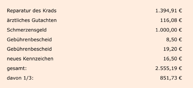 Dieser relativ geringe Ausgleich ist durch die erhebliche Mitverursachung des Klägers zu 2. weiterhin relativiert. Dabei ist zu beachten, dass eine Mitverursachung ein weiterer Bewertungsfaktor ist und – anders als beim Ersatz materieller Schäden – keine Quote nach dem Grad der Mitverursachung zu bilden ist (vgl. Palandt-Grüneberg aaO. Rn. 20).